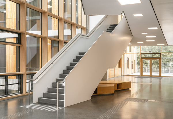 Im 1. Obergeschoss des östlichen Trakts befinden sich die als flexible Nutzungseinheiten geplanten Forschungslabore. Die südliche Laborspange verfügt über eine größere Raumhöhe. Die Labore sind an den Außenseiten angeordnet, während die Mittelzone, wie auch im Erdgeschoss, die Fluchttreppen, Technik- und Nebenräume aufnimmt. Im westlichen Trakt befinden sich die oberen Zugänge zum großen Hörsaal. Die Dienst-, Aufenthalts- und Besprechungsräume sind im 1. und 2. Obergeschoss untergebracht und gruppieren sich um einen Innenhof im westlichen Gebäudeteil. Der östliche Trakt des 2. Obergeschosses ist als Technikebene ausgebildet. Unterhalb des aufgeständerten Gebäudes befindet sich eine Parkebene.