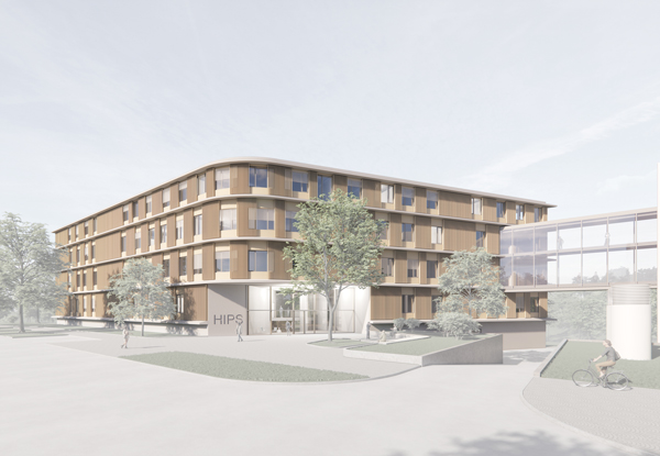 Der Neubau des Helmholtz-Instituts für Pharmazeutische Forschung setzt die straßenbegleitende Bebauung nach Nordosten fort. Entlang des Platzes und der Straße ist der winkelförmige Baukörper mit zurückgesetztem Staffelgeschoss viergeschossig ausgebildet.