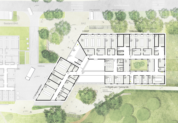 Die Obergeschosse sind in Labor- und Bürobereiche unterteilt. Die Labore orientieren sich zur Straße, die Büros zur Gartenseite. Die modulare Grundrissstruktur ermöglicht eine flexible Nutzung der Laborflächen, deren Medienversorgung über eine direkt angrenzende Schachtzone erfolgt.