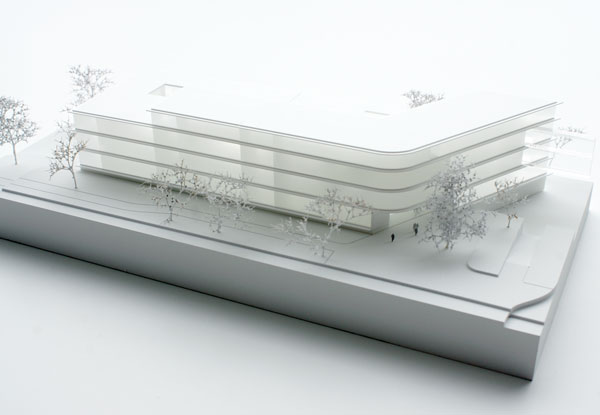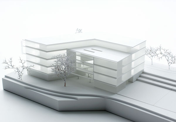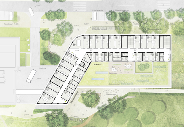 Durch die sich zur Straße öffnende Winkelform des Neubaus entsteht eine großzügige Eingangssituation mit Aufenthaltsbereichen zwischen Bestand und Neubau. Die topographische Situation mit dem zur Gartenseite abfallenden Gelände wird im Gebäudeinneren aufgenommen. Der straßenseitige Eingangsplatz und der gartenseitige Platz sind über eine Treppe und die Halle miteinander verbunden.
